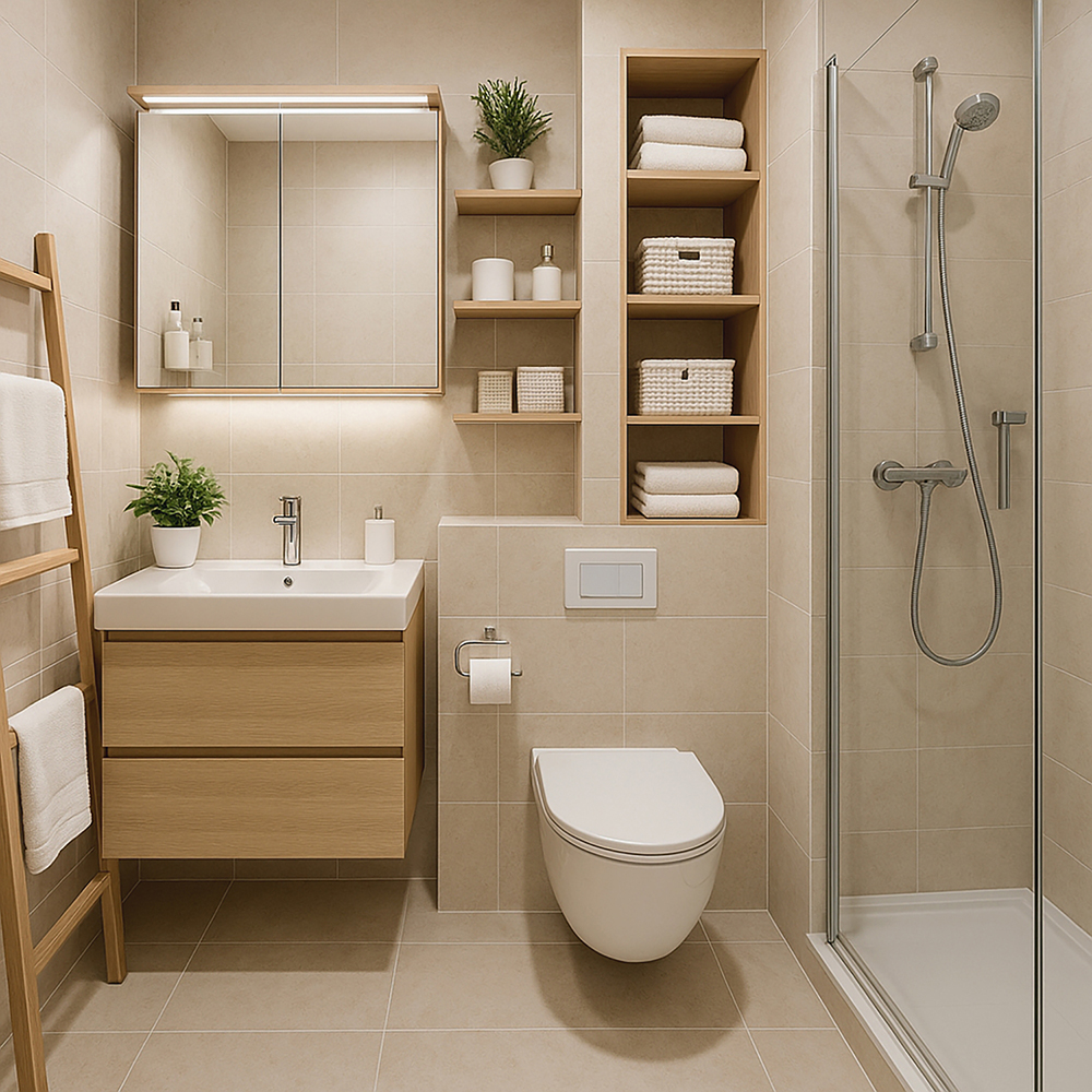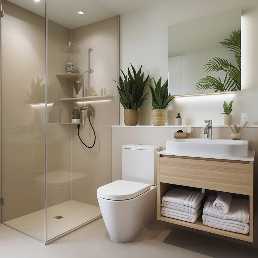 Kis alapterületen általában a zuhanyzó a praktikus megoldás, de egy okosan elhelyezett, rövidebb kád is szóba jöhet. Érdemes teljesen átlátszó, keret nélküli üveg zuhanyfalat választani. Ez megszünteti a vizuális határokat, így nem törik meg a tér, és sokkal tágasabbnak fog tűnni a fürdőszoba. Léteznek olyan modellek, amelyek egyik végükön keskenyebbek, így jobban illeszkednek a helyiség adottságaihoz. A walk-in zuhany pedig nemcsak modern, hanem helytakarékos is – főleg, ha üvegfallal kombináljuk.