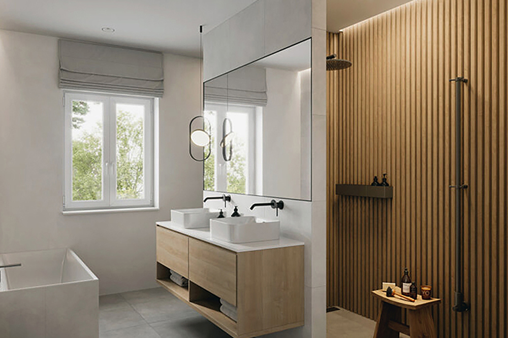 Egy hagyományos ajtó sok helyet foglal, míg egy jól megtervezett tolóajtóval több mozgásterünk marad. Ugyanez igaz a lebegő bútorokra is – ha a mosdószekrény a falra van szerelve, alatta szabadon marad a padló, ami optikailag is tágítja a teret, ráadásul a takarítás is egyszerűbb.