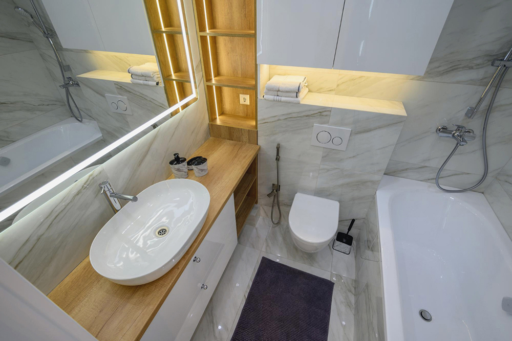 A világos színek, a fényes felületek és a jól megválasztott világítás csodákat művelnek. Egy beépített LED-csík a tükör körül, vagy egy mennyezeti spotlámpa meglepően sokat dobhat a hangulaton – és a térérzeten is. Ha optikailag szeretnénk „nagyítani” a fürdőszobát, kerüljük a sötét tónusokat és a túlzsúfoltságot. Az egyik legegyszerűbb és leghatékonyabb megoldás a világos színek használata. Fehér, krémszín, világosszürke, halvány bézs vagy pasztell árnyalatok vizuálisan tágítják a teret. Ezeket alkalmazhatjuk a falakon, a járólapon és a bútorokon is. Minél egységesebb a színvilág, annál levegősebb lesz az összhatás.