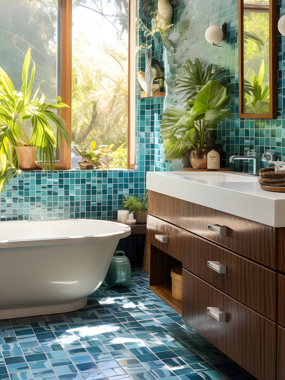Minél kevesebb vizuális „zaj” van a fürdőben, annál tágasabbnak tűnik. Az egységes burkolat (akár falon és padlón is), valamint a visszafogott minták és letisztult formák sokat segítenek. Érdemes elkerülni a túl sok féle színt, különböző csempemintákat.