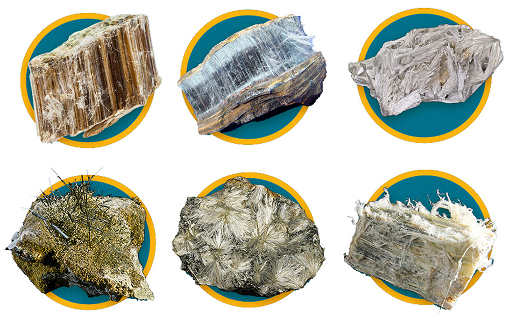 Az azbesztnek számos különféle típusa létezik: aktinolit, amozit (barna azbeszt), antofillit, krizotil (fehér azbeszt), krokidolit (kék azbeszt), tremolit. A krokidolit és az amozit az azbeszt két legveszélyesebb formája: ezek jelentik a legnagyobb veszélyt a rostszálak belégzése esetén. A krokidolitot az 1970-es évek óta nem használják, a régebbi épületekben azonban még sok helyen előfordul. A kritikus tényezőt a rostszálak mérete jelenti: elég kicsinek kell lenniük ahhoz, hogy belélegzéssel a tüdőbe jussanak, ugyanakkor elég nagynak ahhoz, hogy kilégzéskor ne távozzanak el a szervezetből. A krokidolit és az amozit rostszálai ezért tartoznak a legveszélyesebbek közé.