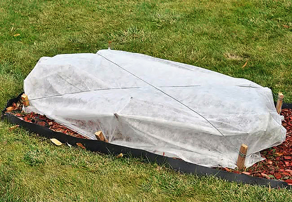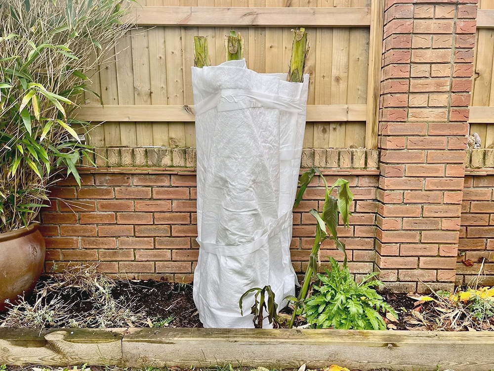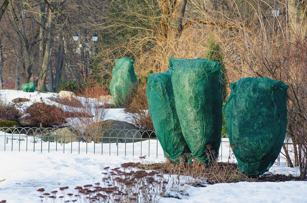 Magasabb, fás szárú, de érzékenyebb növényeket (pl. fiatal örökzöldek, fügék, gránátalmák) fagy elleni takarással védhetünk. Fontos, hogy a takarás ne zárja el teljesen a levegőt, mert az átnedvesedő takaróanyag alatt a növény befülledhet, megindulhat a gombásodás, rothadás. Legyen a takarás anyaga légáteresztő, mint például jutazsák, agrotextil, nádfonat, kartonpapír, fenyőgally. Először karózzuk körbe a növényt, majd lazán tekerjük köré a takaróanyagot. Ne közvetlenül a hajtásokra fektessük az anyagot, hanem hagyjunk egy kis légteret. A tetejét zárjuk le lazán, hogy a csapadék ne áztassa be teljesen. Egyes növényeknél a tövüknél is érdemes szalma- vagy mulcstakarót elhelyezni.