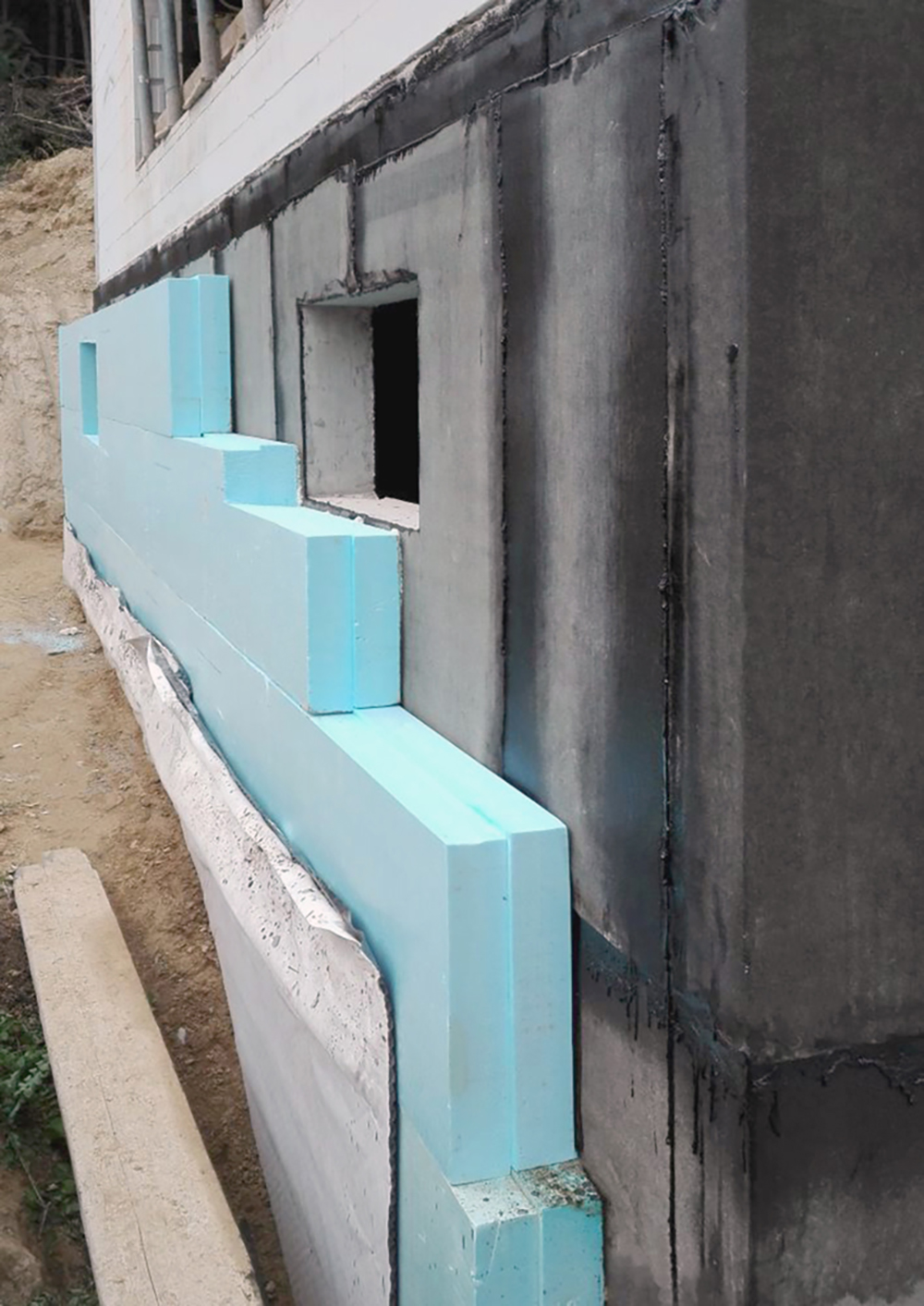 Esetén először a pince falszerkezetére elkészül a bitumenmáz kellősítés, majd a modifikált bitumenes vastaglemez talajnedvesség/talajpára elleni szigetelés. Erre poliuretán alapú ragasztóhabbal sávos ragasztással kerülnek fel az XPS hőszigetelő lapok. Rétegvíz/szivárgó víz esetén ezt a megoldást felületszivárgóval és vízelvezetéssel kell kiegészíteni. Az extrudált polisztirolhab hőszigetelés elé geotextíliával kasírozott, dombornyomott drénlemezt kell alkalmazni, az elfolyó talajvizet pedig kavicságyazatba helyezett perforált dréncsővel kell elvezetni az épület alapzatától.