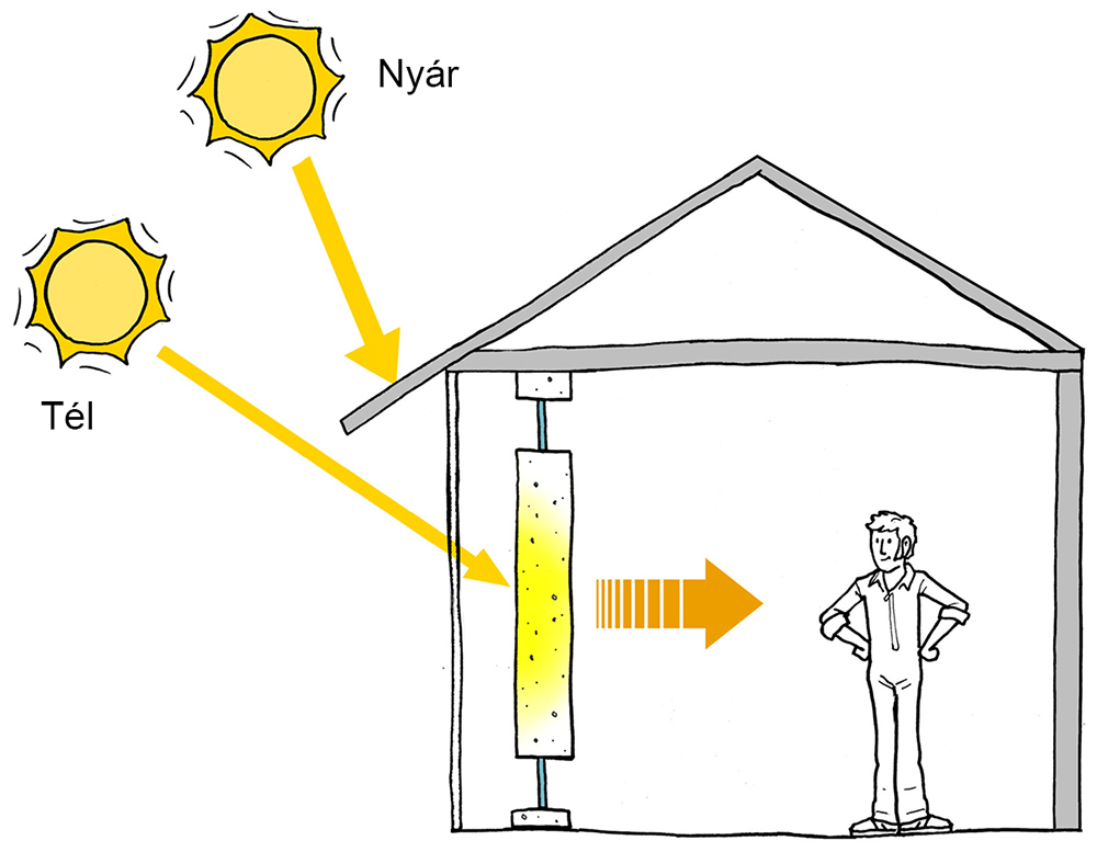 Télen a teljes hőveszteség 65%-a éjjel, míg 35%-a nappal következik be. Tehát a napközben bejutó energia 65%-át tárolni kell éjszakára. A hőtárolás fontos szerepe abban rejlik, hogy a nagy felületű ablakokon bejutó napsugárzás energiáját a fal tárolja, éjjel pedig a fal mögötti helyiségnek átadja. A tömegfal késleltetése a méretezés fontos eleme. Télen este az árnyékolót leengedjük, hogy a kifelé irányuló hőáram kisebb legyen. Nyáron az árnyékolót zárva kell tartani. Amennyiben az üveg és a tömegfal által határolt térben a hőmérséklet melegebb, mint a külső hőmérséklet, a kifelé néző alul-felül elhelyezett ablakokat is nyitva kell tartani.