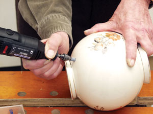 A forma tehát megvolt, most már belemerülhettünk a részletekbe. Először is a porcelánedény alját kellett kifúrnunk a tápvezeték számára. Ez elég fogós feladatnak látszott, ám a szilíciumkarbid anyagú csapos csiszolókövek és a kis Dremel multigép átsegített e nehéz faladaton. Egy kúpos kővel fokozatosan, és elég lassan haladva sikerült lyukat csiszolni az 5 mm falvastagságú porcelánedény aljába. A kis lyukat ezt követően már nem volt gond egy nagyobb kővel a kábel méretéhez szükséges nagyságúra bővíteni.